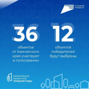 Проходит голосование с 21 апреля по 12 июня 2026 года. От Камчатского края представлено 36 общественных пространств, из которых по итогам голосования будут определены 12 территорий для благоустройства.